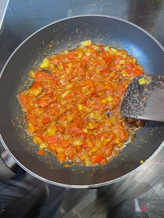 - Stir-fry for 2 minutes and add diced tomato and close pan until tomato is soft